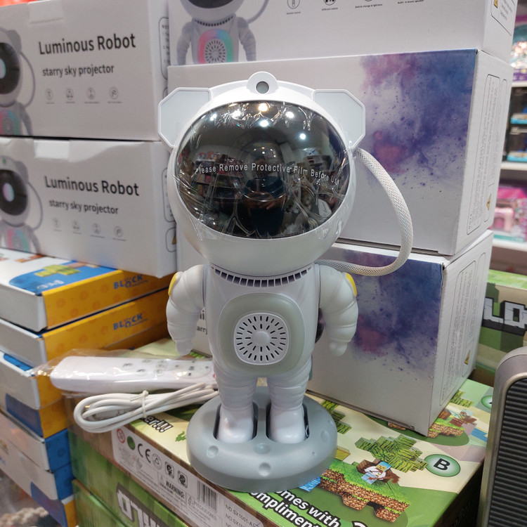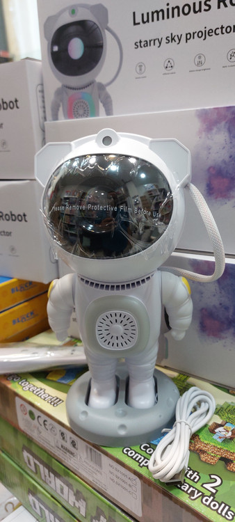 چراغ خواب رقص نور دار کهکشانی طرح فضانورد مدل بلوتوثی اسپیکر دار یک چراغ خواب یا نورپردازی با قابلیت پخش افکت تصویر زنده کهکشانی در رنگ های مختلف به همراه لیزر ستاره ای بر روی سقف و دیوار اتاق یا هر سطح دیگری است که به همراه افکت لیزر ستاره ای حس یک سفر کهکشانی را به شما میدهد . این رقص نور کهکشانی دارای یک اسپیکر بلوتوثی قوی در قسمت پشت سر خود می باشد که میتواند برای شما هر موسیقی را از طریق گوشی یا تبلت پخش نمایید تا بتوانید از آن لذت ببرید. همچنین قابلیت قرار دادن رم میکرو و پخش موزیک از طریق آن را دارا می باشد. تلفیق همزمان تصویر زنده کهکشانی و لیزر ستاره ای و اسپیکر بلوتوثی جذابیت اتاق خواب و یا هر محیطی که در آن قرار دارید را در هنگام شب چندین برابر میکند. این محصول دارای ریموت کنترل نیز می باشد که میتواند تمامی دستور های مورد نیاز از قبیل روشن و خاموش، ولوم صدا، میزان سرعت چرخش موتور، میزان نور پرژکتور یا لیزر را کم یا زیاد و یا برای روشن ماندن محصول تایمر تعریف کنید که سر ساعت مشخص شده خاموش بشود. همچنین قابلیت تغییر موزیک، قطع و وصل موزیک، تغییر مود و حالت های رنگی مختلف را دارا می باشد. این رقص نور جذاب دارای درگاه برق USB Type-c می باشد که می توانید آن را با پاوربانک یا آداپتور موبایل یا هر دستگاه دیگری روشن کنید و هرجایی که دوست دارید استفاده کنید و لذت ببرید. از دیگر ویژگی های این محصول قابلیت هماهنگی ریتم رقص نور با موزیک می باشد که آن را به یک رقص نور جذاب تبدیل کرده و مراسمات و جشن های شما را زیبا و دلنشین تر خواهد کرد.