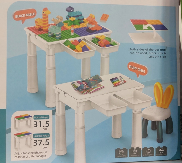 این مجموعه شامل یک میز چندکاره، یک صندلی مناسب برای کودکان و چندین قطعه بلوک ساختمانی است که برای شروع بازی و یادگیری کافی به نظر میرسد.